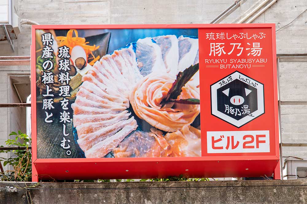 豚乃湯(ぶたのゆ)は、那覇市の国際通りにある沖縄料理の店。看板メニューは、沖縄県産豚である「キビまる豚」を使ったしゃぶしゃぶ。キビまる豚は、旨み・甘み成分が強く、和牛のような細かいサシが入った肉質が特徴で、ラフテーやてびち等でもご提供。上品でさっぱりとした脂身部分は特に絶品!現地の店だからこそ提供可能な希少なブランド豚をぜひご賞味ください。